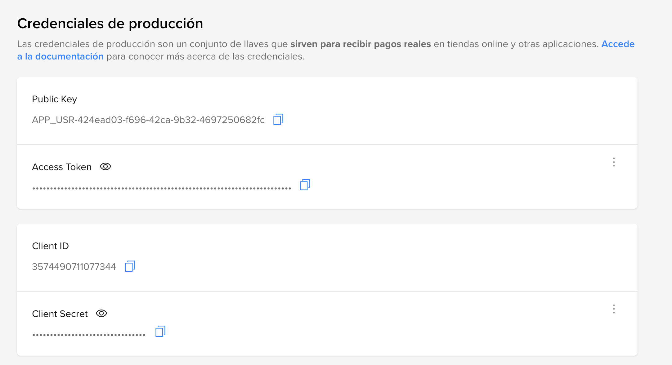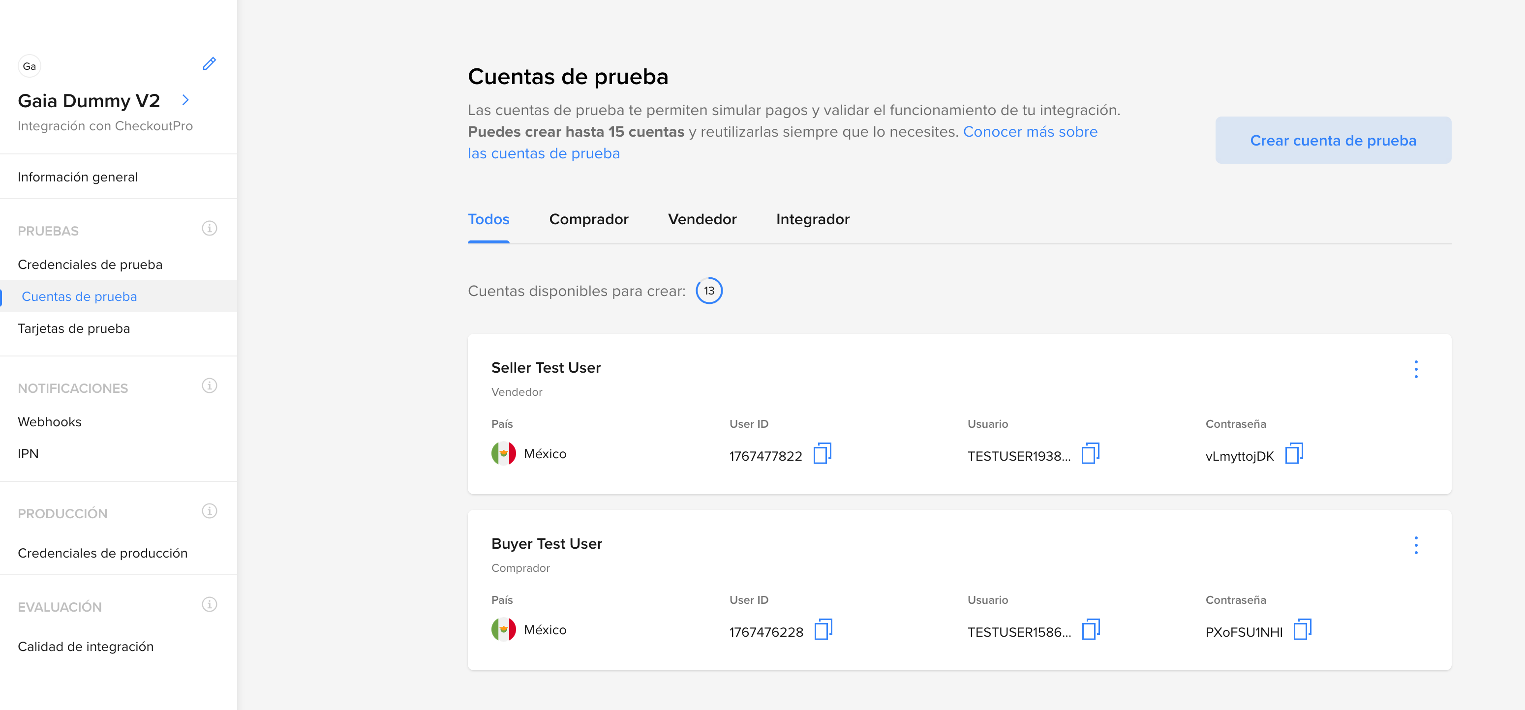 Ya estando en el panel de pruebas, se activan las credenciales de producción (en la cuenta de pruebas)