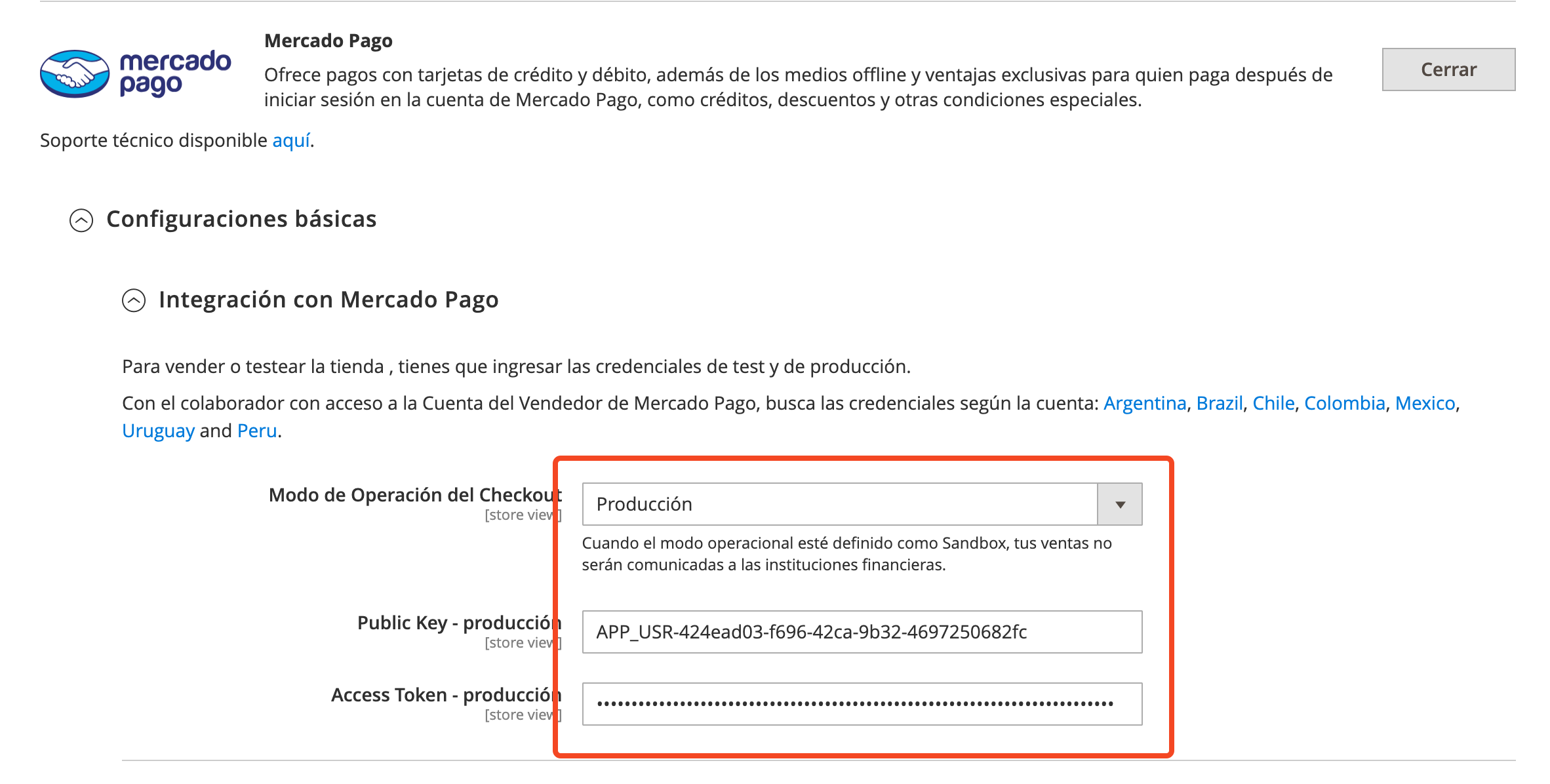 Es importante configurarlo en modo Producción pero usando las credenciales de la cuenta de pruebas.