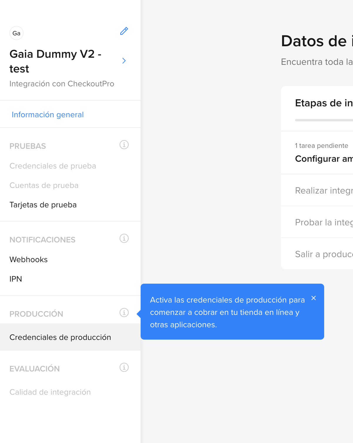 Ya estando en el panel de pruebas, se activan las credenciales de producción (en la cuenta de pruebas)