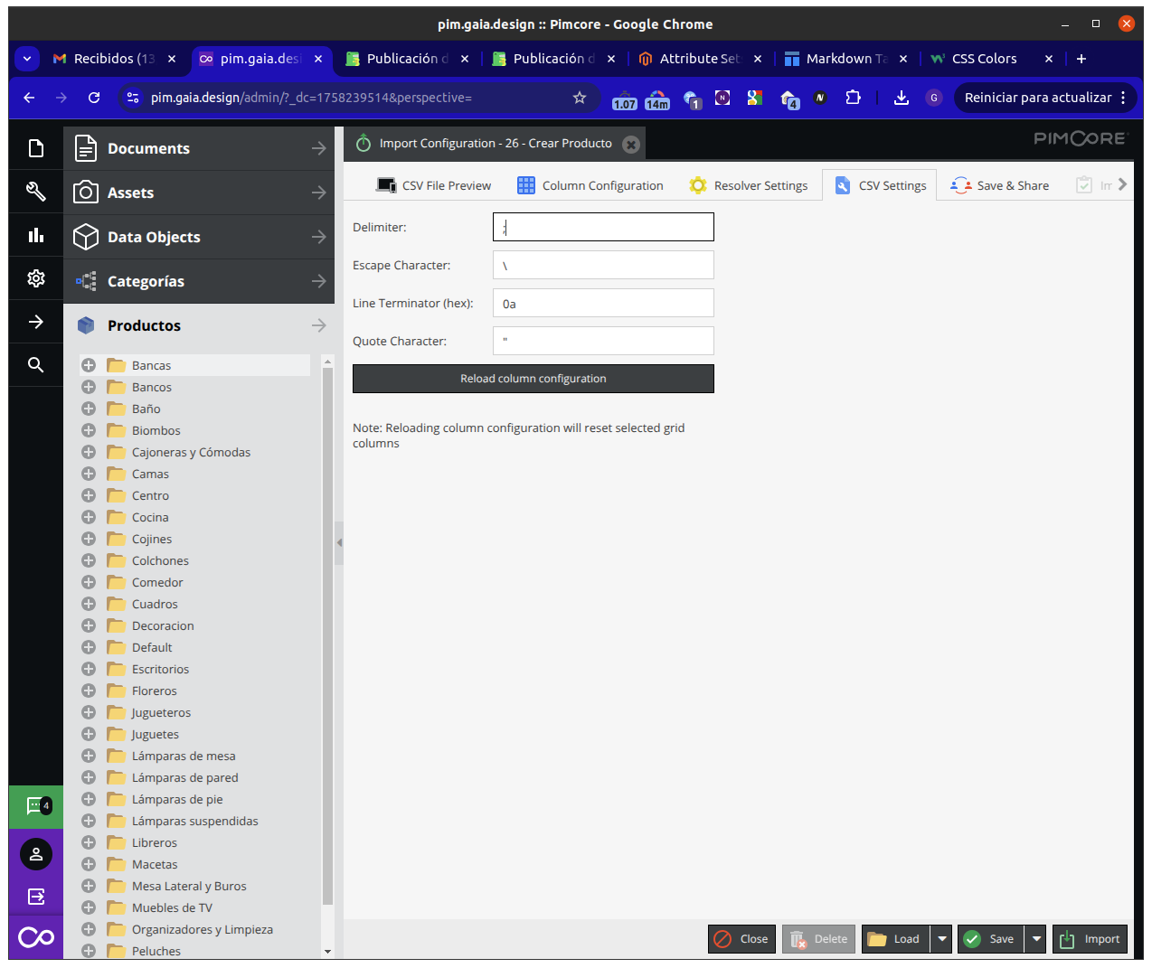 Cuando se carga la configuración hay que ir a la tab "Column Configuration" y verificar que las columnas del csv hagan match con los atributos de pim